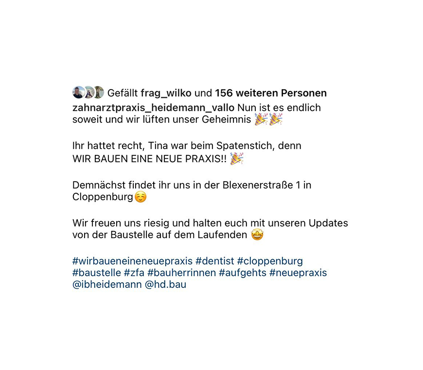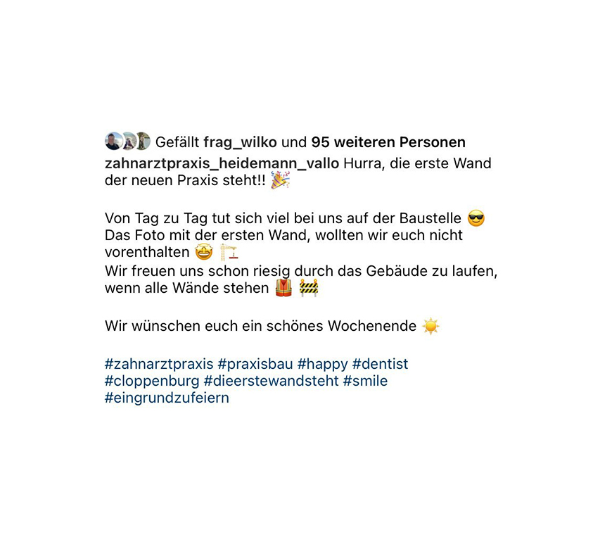Updates von der Baustelle, interessante Einblicke in unseren Praxisalltag und weitere Infos erhalten Sie übrigens auf Instagram – folgen Sie gerne unserem Profil zahnarztpraxis_heidemann_vallo.